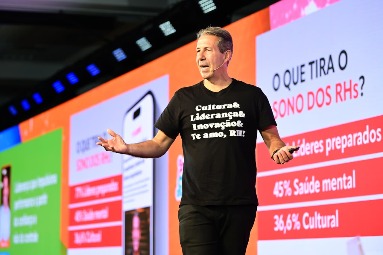 Adriano defendeu que “a falta de liderança devora a estratégia e a cultura no almoço” e afirmou que liderar é entregar resultados de maneira sustentável, sendo gerência e liderança funções complementares. Ele apresentou as principais preocupações do RH — 77% dos líderes não preparados para o futuro, saúde mental e cultura organizacional — e alertou que essa ausência de liderança tem adoecido as pessoas e as empresas. O caminho, segundo ele, é a liderança humanizada, que busca equilibrar resultados e empatia, rompendo paradigmas de modelos autoritários de gestão.